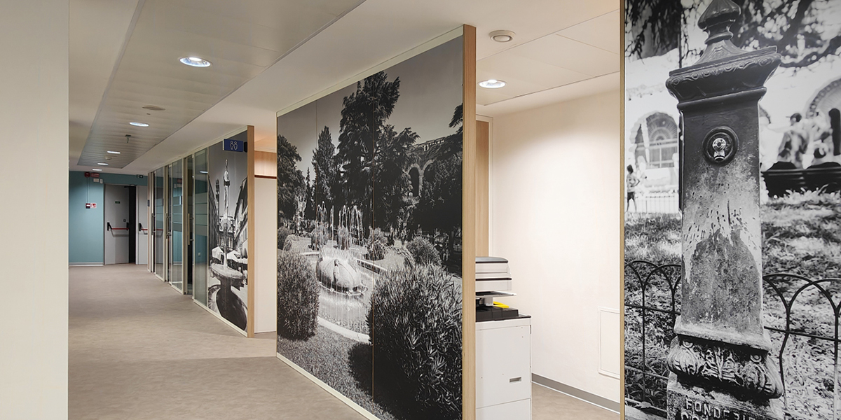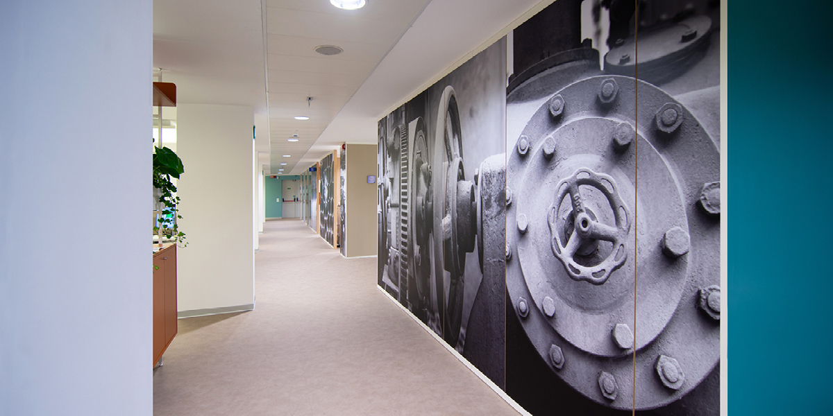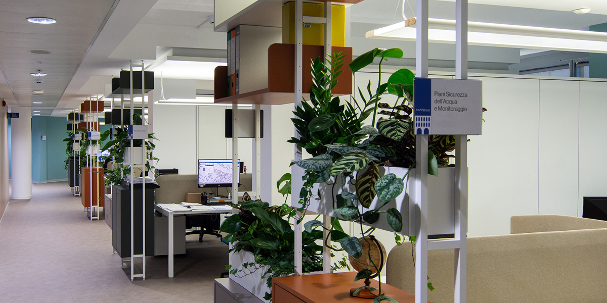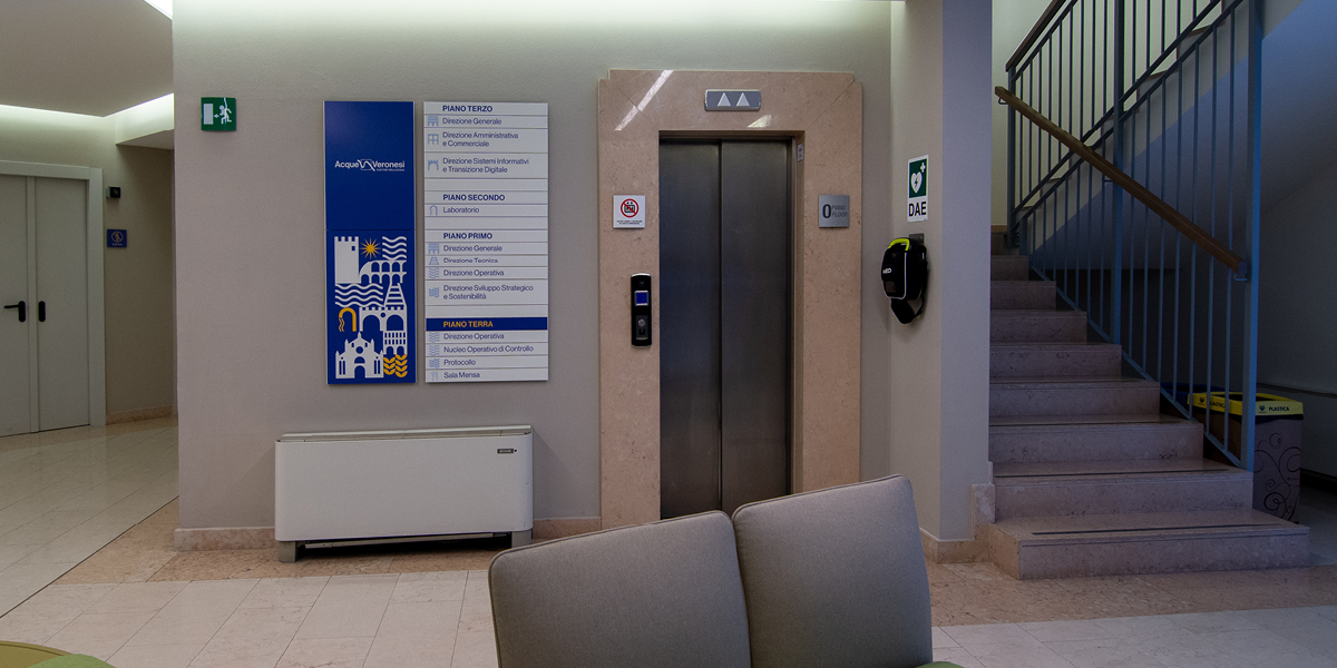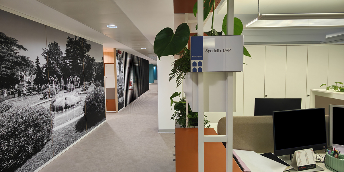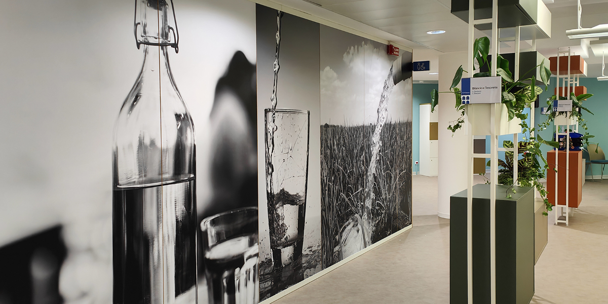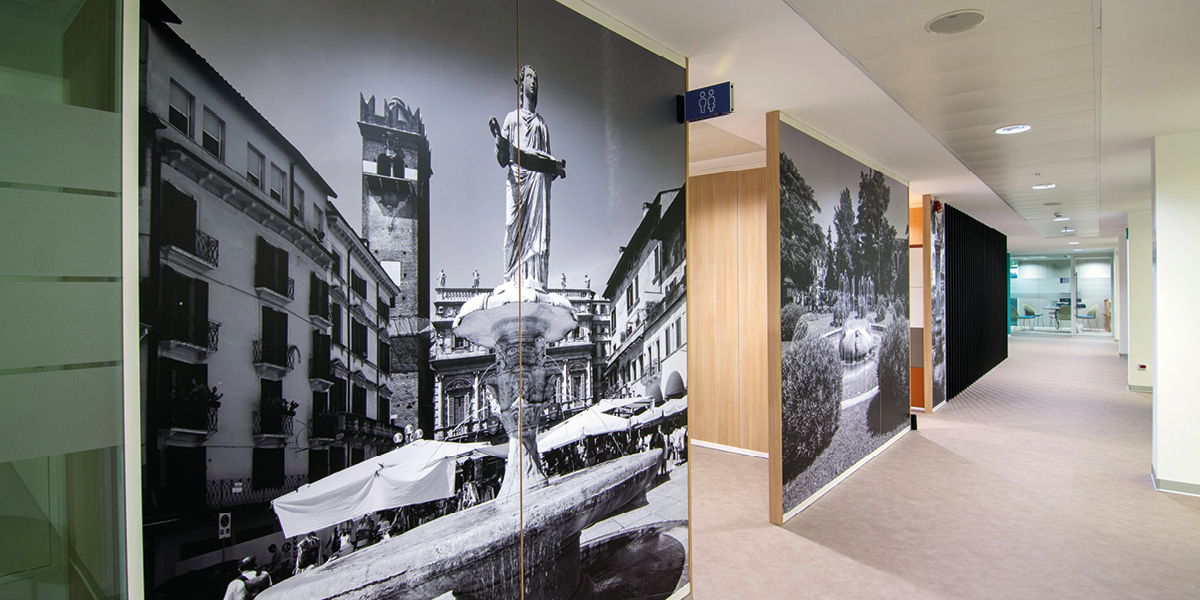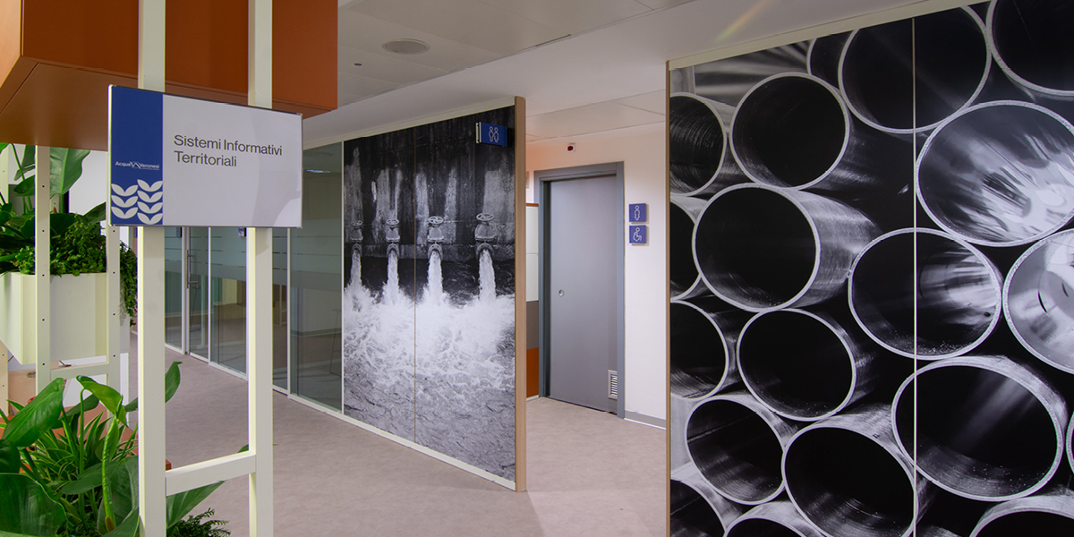 A completamento dell’intervento, le pareti sono state decorate con grafiche murali personalizzate, caratterizzate da immagini evocative legate ai temi dell’acqua, dell’idraulica e della città di Verona, rafforzando il legame tra l’identità aziendale, il territorio e la mission di Acque Veronesi.