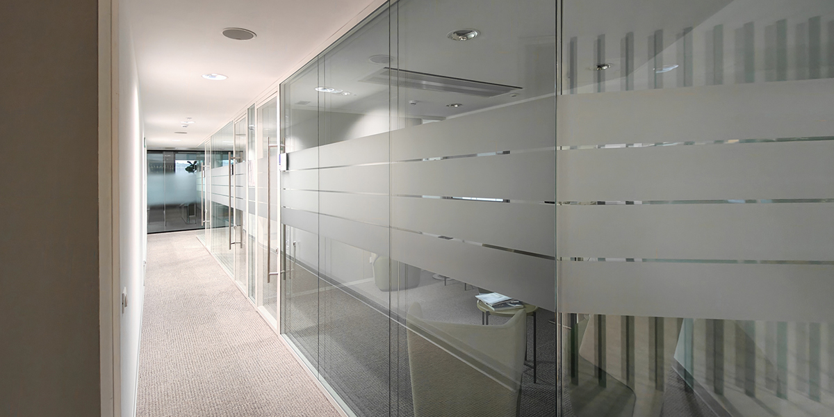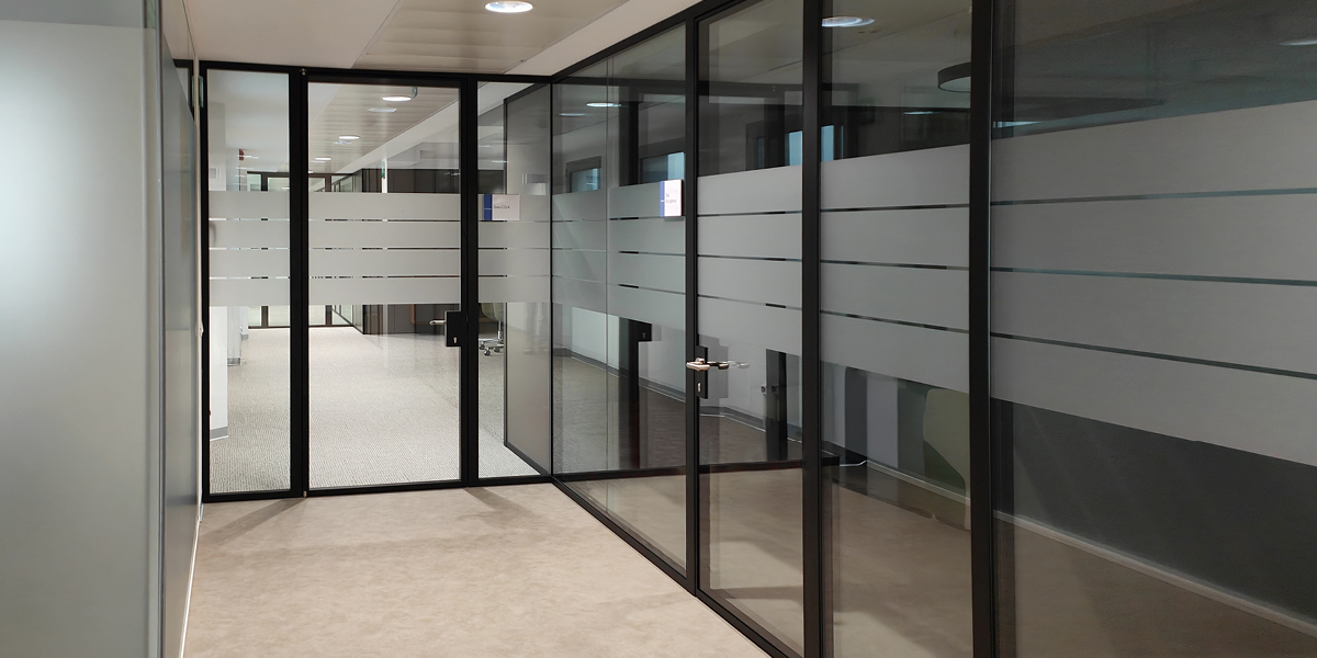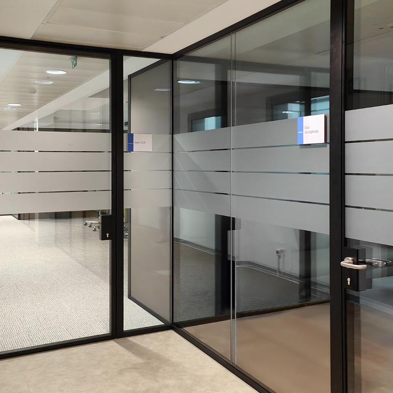 Per aumentare la riservatezza degli ambienti vetrati senza rinunciare alla luminosità, sono state inserite fasce in pellicola satinata, capaci di mantenere continuità visiva e comfort negli spazi di lavoro.