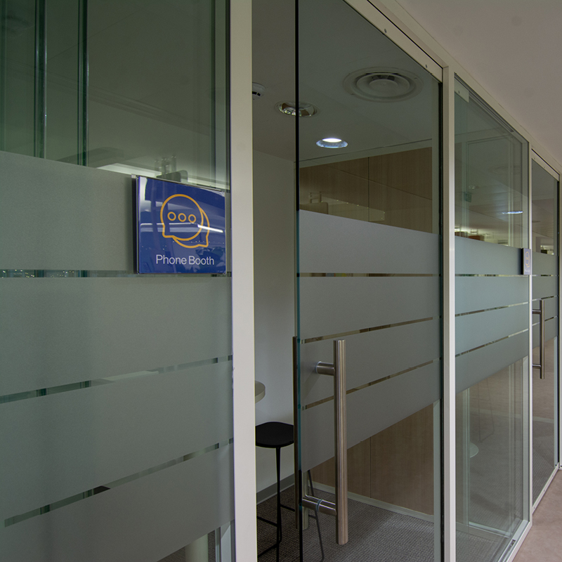 Il risultato è un ambiente di lavoro funzionale e coerente, in cui segnaletica, grafica e soluzioni per la privacy dialogano con l’architettura, contribuendo a definire una sede contemporanea, efficiente e riconoscibile.